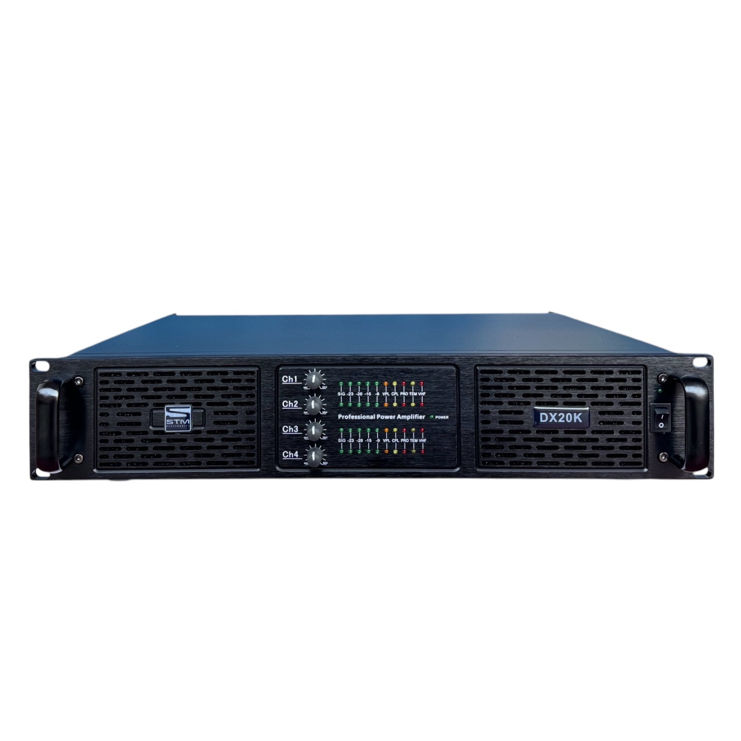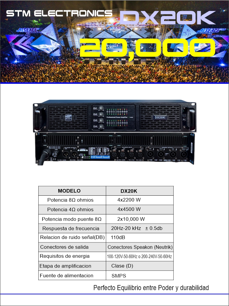20,000 WATTS POTENCIA 4X4500 WATTS 4Ω ohmios 4 x 2200 W a 8Ω4 x 4500 W a 4Ω2 x 10,000 W en modo puente a 8Ω Con el DX20K, no solo inviertes en potencia, sino en calidad, fiabilidad y tecnología de vanguardia.