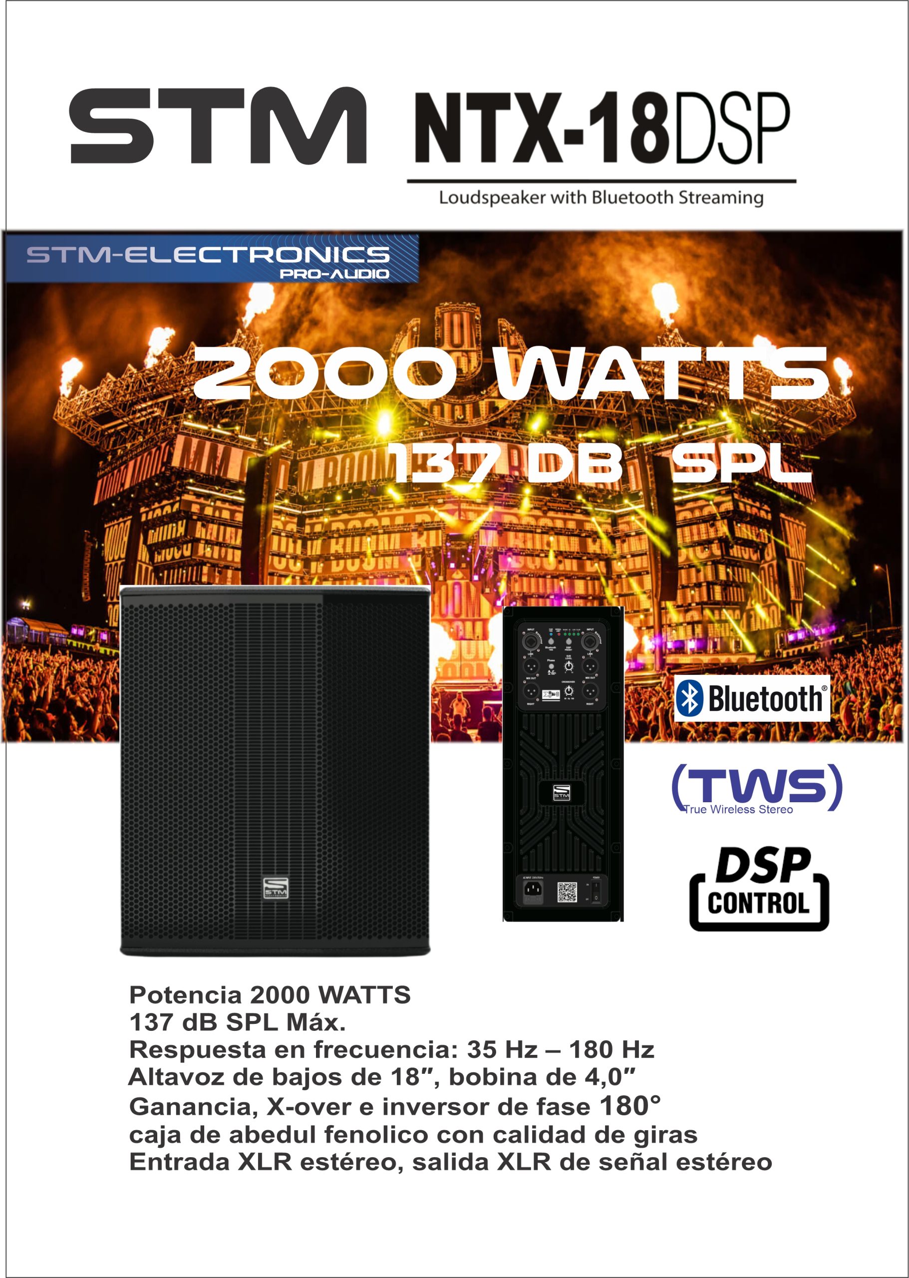 EL NTX18 DSP es un sub-bajo compacto y potente de configuración bass reflex. Gracias al potente woofer de 18”, con bobina móvil de 4 ”, y el amplificador de 2000 Watts , el SUB de STM NTX18 es la herramienta ideal para incrementar el rendimiento en graves de un sistema portátil de refuerzo sonoro, tanto en instrumentos o música . Gracias al filtro de cruce estéreo digital integrado (DSP) con frecuencia de cruce ajustable, puede configurarse rápida y fácilmente con un satélite. El STM ELECTRONICS NTX18 DSP se combina fácilmente con cualquier modelo de la marca. Características * 2000 W * 137 dB SPL Máx. * Respuesta en frecuencia: 35 Hz– 180 Hz * Altavoz de bajos de 18″, bobina de 4,0″ * Ganancia, X-over y retardo seleccionables * Recinto de pino abedul con calidad de giras * Entrada XLR estéreo, salida XLR de señal estéreo * Inversor de fase 180 * Bluetooth /TWS * Sistema de limitación de señal * 4 presets music ,dj ,live , club * Sistema de limitación integrado * Pernos para instalación de ruedas